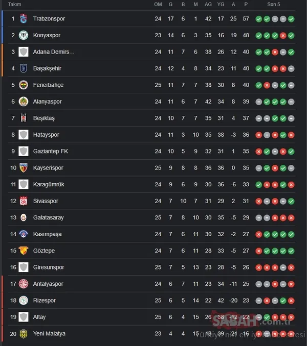 Süper Ligde 2021-2022 sezonu 24. Fenerbahçe ve Galatasarayın ardından lider Trabzonspor bugün Konyasporla Beşiktaş ise yarın Adana Demirsporla karşılaşacak. İşte Süper Ligde güncel puan durumu 202122 sezonu 25.